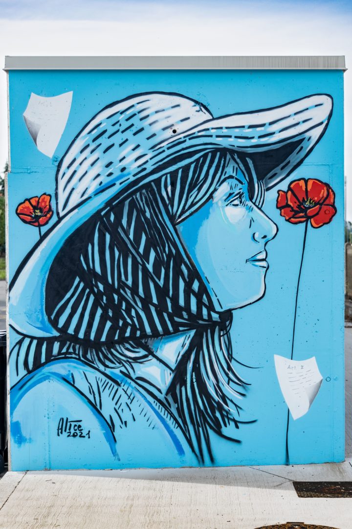 L’opera, dal titolo “Mille papaveri rossi”, situata presso il piazzale della Stazione Ferroviaria, è stata realizzata dalla street artist di fama internazionale Alice Pasquini, in arte Alicè, la cui ricerca artistica è da sempre dedicata alle donne, da lei ritratte in momenti quotidiani, emozionali, in atmosfere lontane dallo stereotipo donna-oggetto.